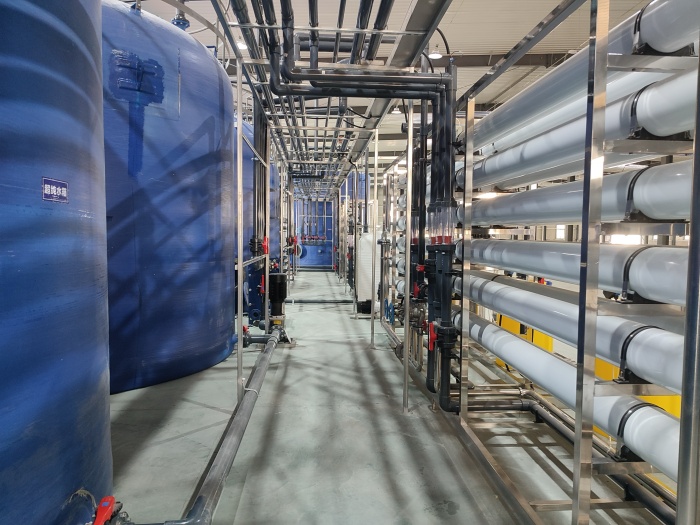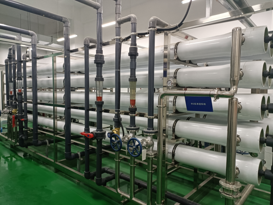 原水→原水箱→原水增壓泵→石英砂過濾器→活性炭過濾器→阻垢劑投加設(shè)備-→精密過濾器→級(jí)高壓泵→級(jí)反滲透主機(jī)→PH調(diào)節(jié)投加設(shè)備→中間水箱→二級(jí)高壓泵→二級(jí)反滲透主機(jī)→生產(chǎn)用水→純水桶→輸送泵→攪拌桶→輸送泵→成品溶液過濾系統(tǒng)→成品桶。